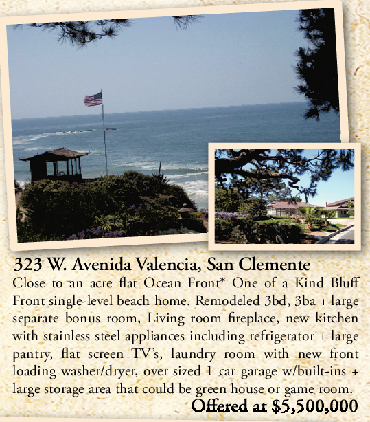 323 W. Avenida Valencia, San Clemente Close to an acre flat Ocean Front* One of a Kind Bluff Front single-level beach home. Remodeled 3bd, 3ba + large separate bonus room, Living room fireplace, new kitchen with stainless steel appliances including refrigerator + large pantry, flat screen TV’s, laundry room with new front loading washer/dryer, over sized 1 car garage w/built-ins + large storage area that could be green house or game room.
