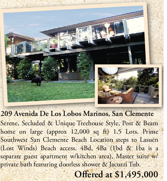 209 Avenida De Los Lobos Marinos, San Clemente Serene, Secluded & Unique Treehouse Style, Post & Beam home on large (approx 12,000 sq ft) 1.5 Lots. Prime Southwest San Clemente Beach Location steps to Lasuen (Lost Winds) Beach access. 4Bd, 4Ba (1bd & 1ba is a separate guest apartment w/kitchen area), Master suite w/ private bath featuring doorless shower & Jacuzzi Tub. Offered at $1,495,000