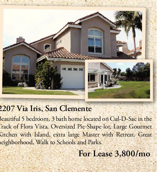 2207 Via Iris, San Clemente Beautiful 5 bedroom, 3 bath home located on Cul-D-Sac in the Track of Flora Vista. Oversized Pie Shape lot, Large Gourmet Kitchen with Island, extra large Master with Retreat. Great neighborhood, Walk to Schools and Parks. For Lease 3,800/mo