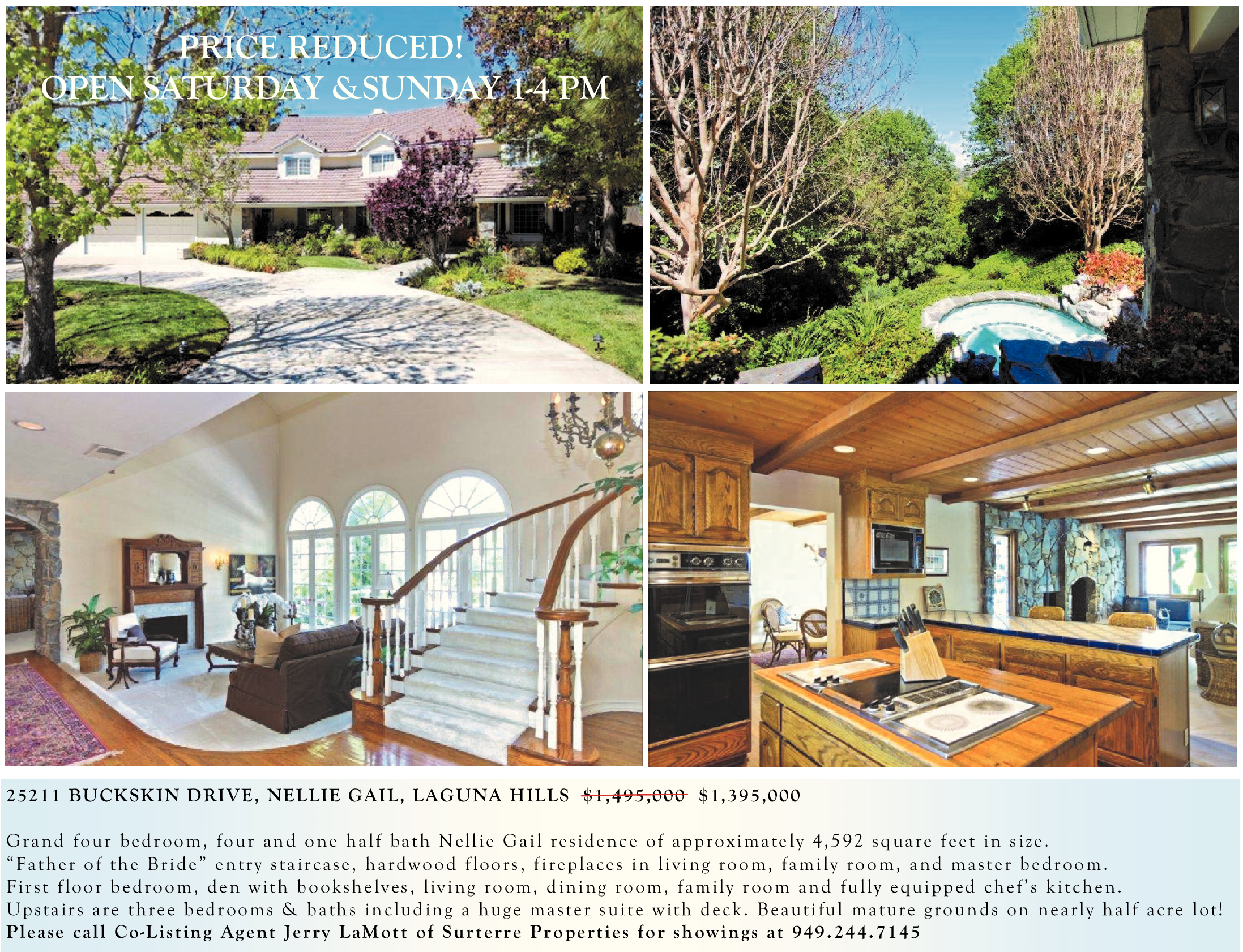 PRICE REDUCED! OPEN SATURDAY &SUNDAY 1-4 PM 25211 BUCKSKIN DRIVE, NELLIE GAIL, LAGUNA HILLS $1,495,000 $1,395,000 Grand four bedroom, four and one half bath Nellie Gail residence of approximately 4,592 square feet in size. “Father of the Bride” entry staircase, hardwood floors, fireplaces in living room, family room, and master bedroom. First floor bedroom, den with bookshelves, living room, dining room, family room and fully equipped chef’s kitchen. Upstairs are three bedrooms & baths including a huge master suite with deck. Beautiful mature grounds on nearly half acre lot! Please call Co-Listing Agent Jerry LaMott of Surterre Properties for showings at 949.244.7145 See also