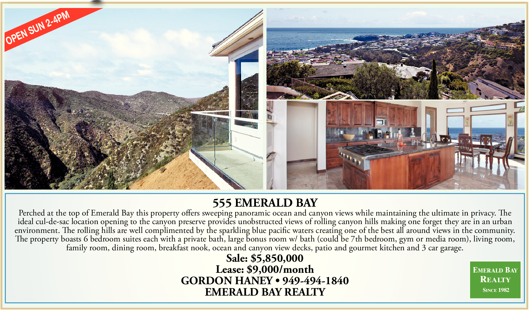 555 EMERALD BAY Perched at the top of Emerald Bay this property offers sweeping panoramic ocean and canyon views while maintaining the ultimate in privacy. The ideal cul-de-sac location opening to the canyon preserve provides unobstructed views of rolling canyon hills making one forget they are in an urban environment. The rolling hills are well complimented by the sparkling blue pacific waters creating one of the best all around views in the community. The property boasts 6 bedroom suites each with a private bath, large bonus room w/ bath (could be 7th bedroom, gym or media room), living room, family room, dining room, breakfast nook, ocean and canyon view decks, patio and gourmet kitchen and 3 car garage. Sale: $5,850,000 Lease: $9,000/month EMERALD BAY GORDON HANEY • 949-494-1840 REALTY SINCE 1982 EMERALD BAY REALTY