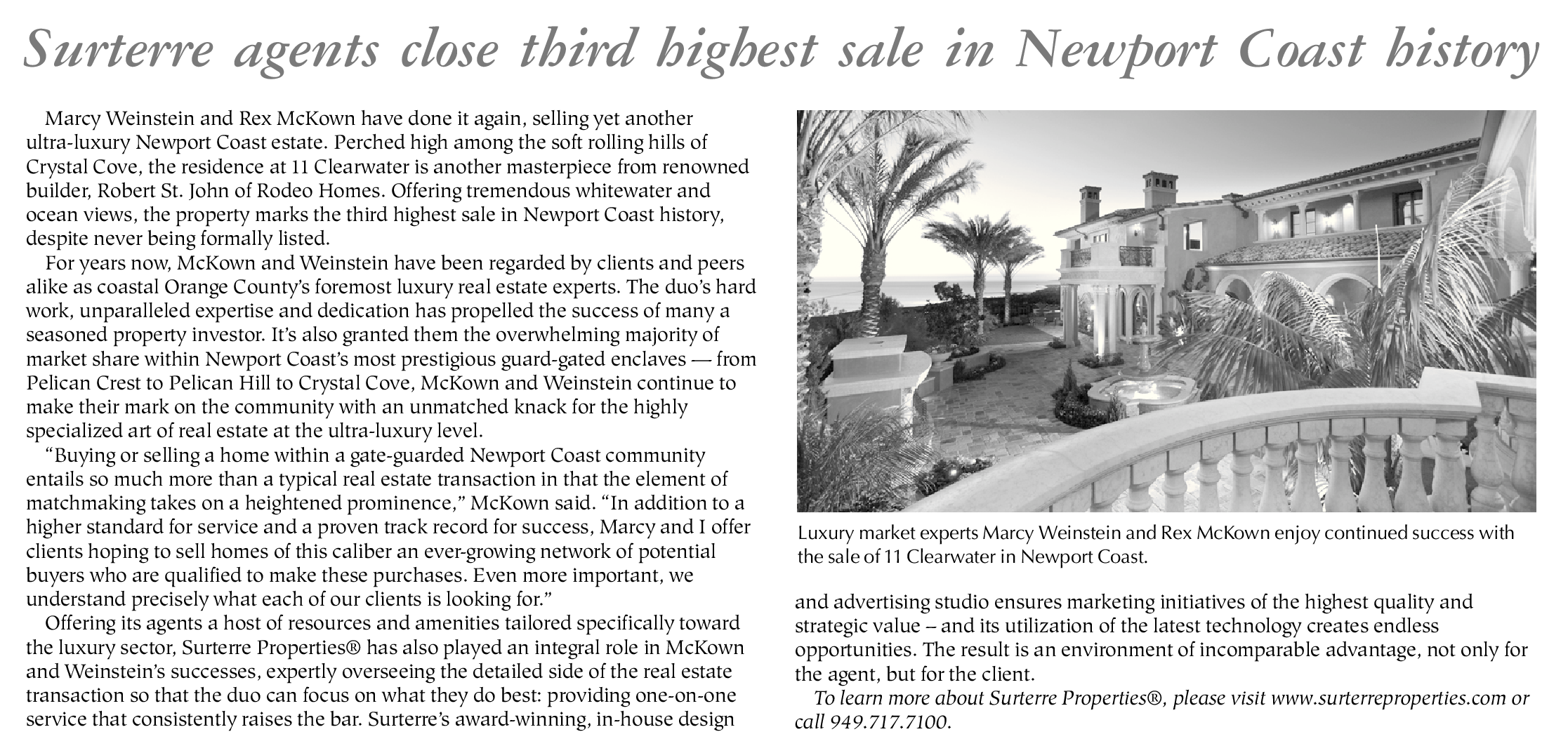 Marcy Weinstein and Rex McKown have done it again, selling yet another ultra-luxury Newport Coast estate. Perched high among the soft rolling hills of Crystal Cove, the residence at 11 Clearwater is another masterpiece from renowned builder, Robert St. John of Rodeo Homes. Offering tremendous whitewater and ocean views, the property marks the third highest sale in Newport Coast history, despite never being formally listed.