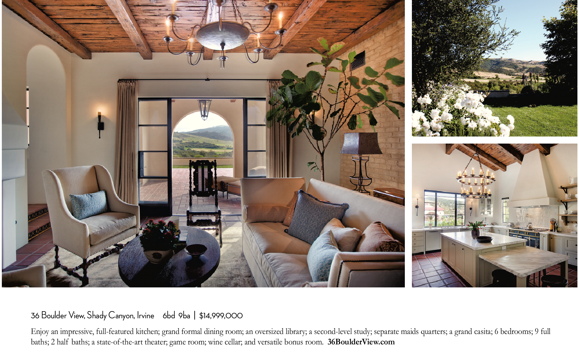36 Boulder View, Shady Canyon, Irvine 6bd 9ba | $14,999,000 Enjoy an impressive, full-featured kitchen; grand formal dining room; an oversized library; a second-level study; separate maids quarters; a grand casita; 6 bedrooms; 9 full baths; 2 half baths; a state-of-the-art theater; game room; wine cellar; and versatile bonus room. 36BoulderView.com