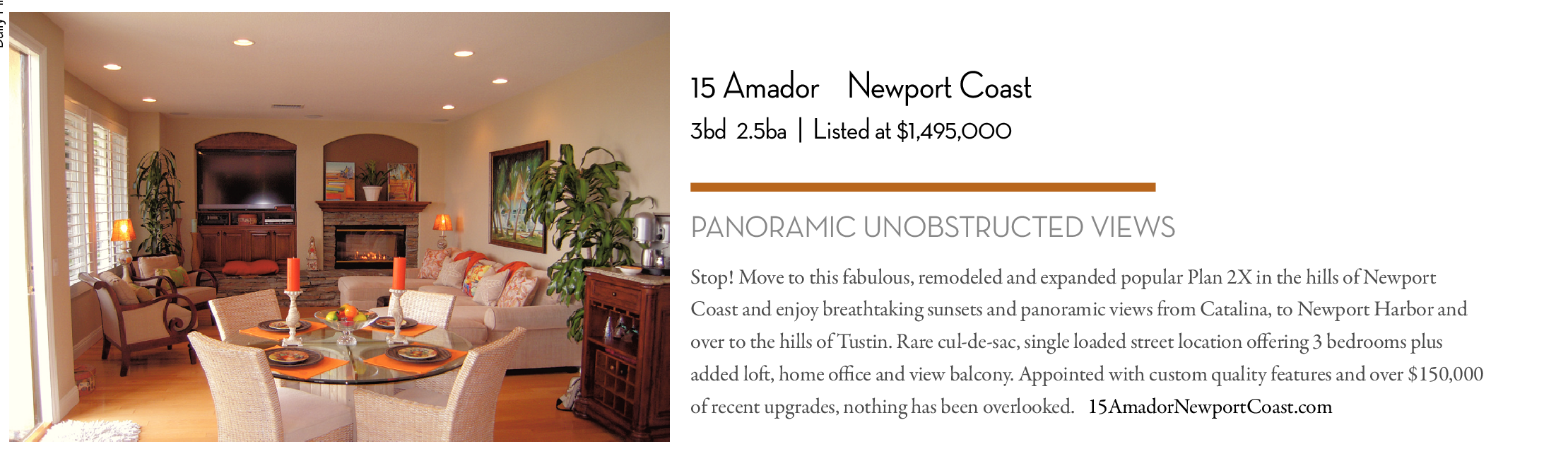 15 Amador Newport Coast 3bd 2.5ba | Listed at $1,495,000 PANORAMIC UNOBSTRUCTED VIEWS Stop! Move to this fabulous, remodeled and expanded popular Plan 2X in the hills of Newport Coast and enjoy breathtaking sunsets and panoramic views from Catalina, to Newport Harbor and over to the hills of Tustin. Rare cul-de-sac, single loaded street location offering 3 bedrooms plus added loft, home office and view balcony. Appointed with custom quality features and over $150,000 of recent upgrades, nothing has been overlooked. 15AmadorNewportCoast.com
