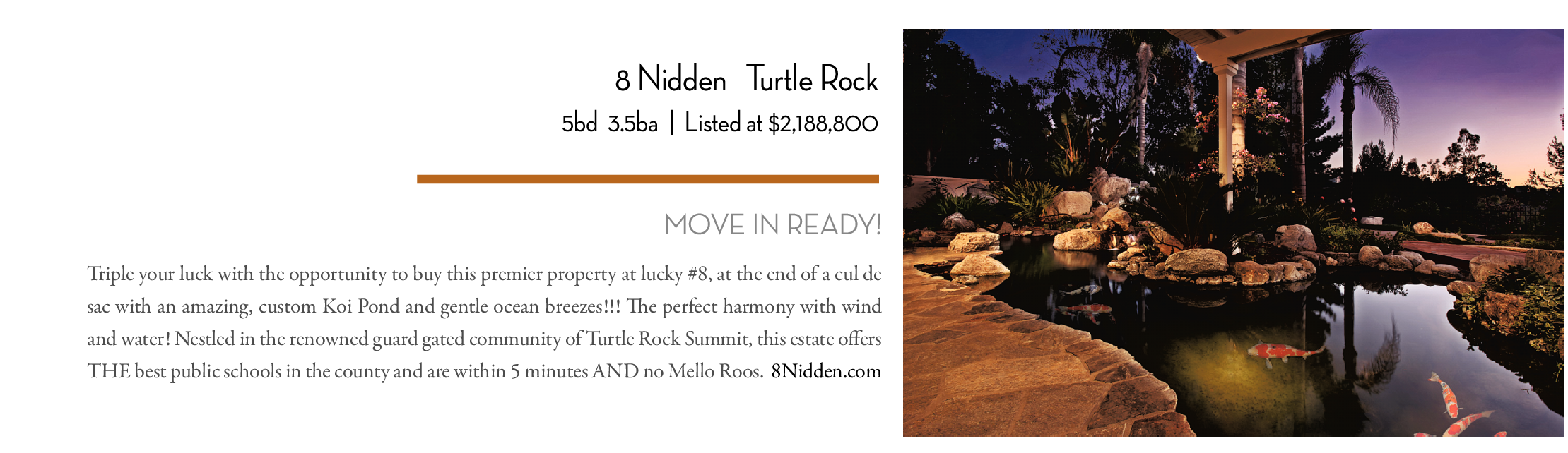 Triple your luck with the opportunity to buy this premier property at lucky #8, at the end of a cul de sac with an amazing, custom Koi Pond and gentle ocean breezes!!! The perfect harmony with wind and water! Nestled in the renowned guard gated community of Turtle Rock Summit, this estate offers THE best public schools in the county and are within 5 minutes AND no Mello Roos. 8Nidden.com