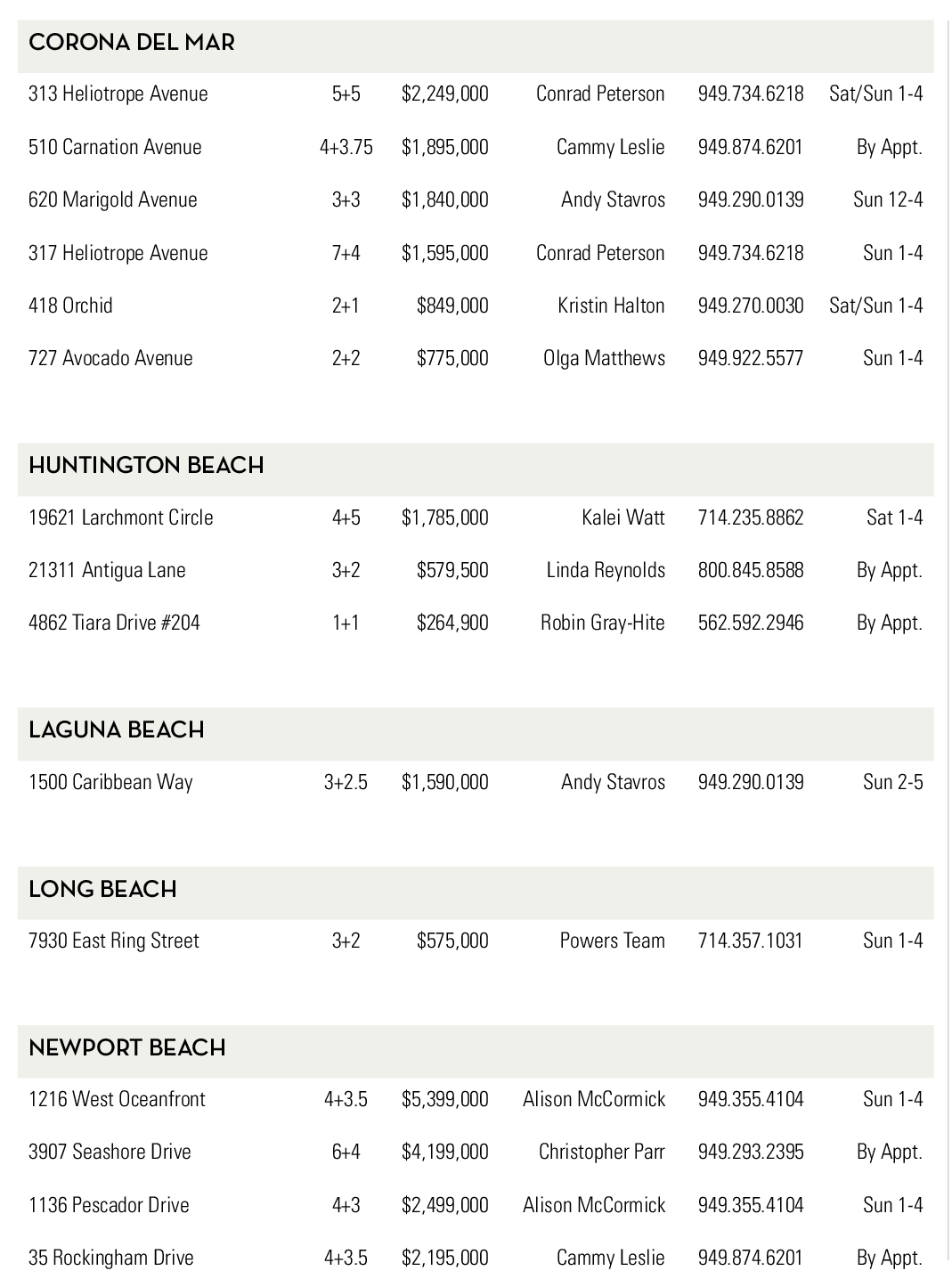 313 Heliotrope Avenue 5+5 $2,249,000 Conrad Peterson 949.734.6218 Sat/Sun 1-4