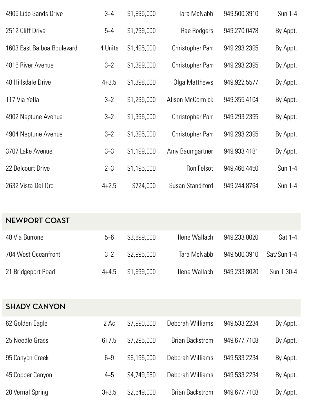 704 West Oceanfront 3+2 $2,995,000 Tara McNabb 949.500.3910 Sat/Sun 1-4