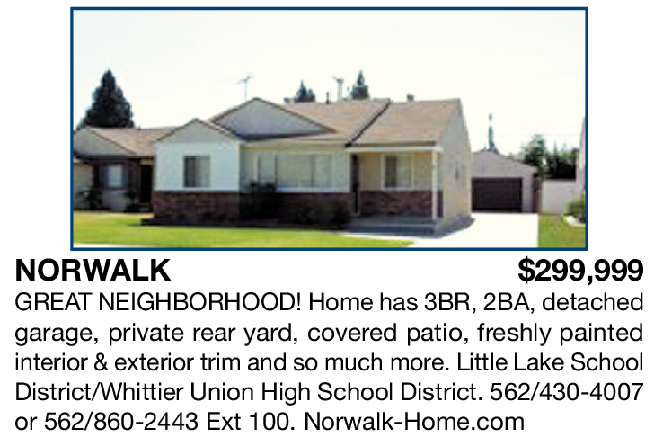 NORWALK $299,999 GREAT NEIGHBORHOOD! Home has 3BR, 2BA, detached garage, private rear yard, covered patio, freshly painted interior & exterior trim and so much more. Little Lake School District/Whittier Union High School District. 562/430-4007 or 562/860-2443 Ext 100. Norwalk-Home.com