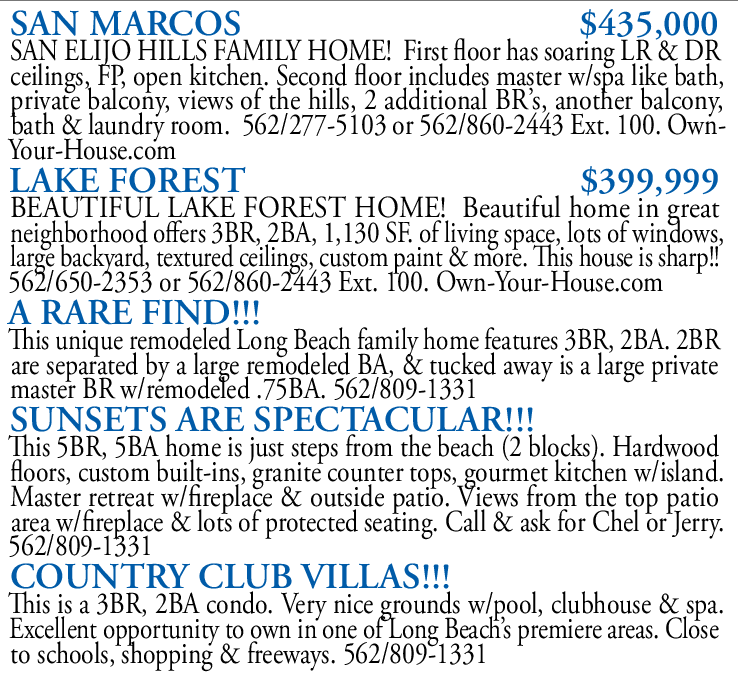 SAN MARCOS $435,000 SAN ELIJO HILLS FAMILY HOME! First floor has soaring LR & DR ceilings, FP, open kitchen. Second floor includes master w/spa like bath, private balcony, views of the hills, 2 additional BR’s, another balcony, bath & laundry room. 562/277-5103 or 562/860-2443 Ext. 100. Own- Your-House.com LAKE FOREST $399,999 BEAUTIFUL LAKE FOREST HOME! Beautiful home in great neighborhood offers 3BR, 2BA, 1,130 SF. of living space, lots of windows, large backyard, textured ceilings, custom paint & more. This house is sharp!!
