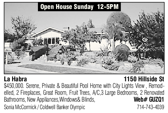 La Habra 1150 Hillside St $450,000. Serene, Private & Beautiful Pool Home with City Lights View , Remodelled, 2 Fireplaces, Great Room, Fruit Trees, A/C,3 Large Bedrooms, 2 Renovated