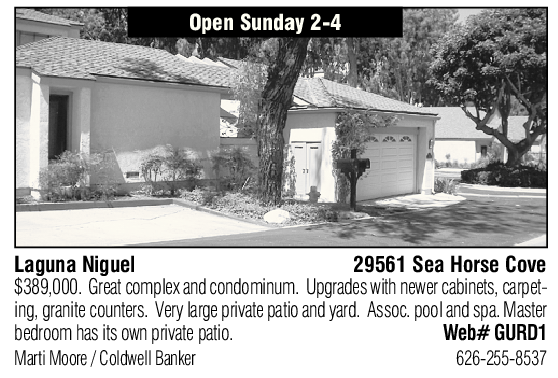 Laguna Niguel 29561 Sea Horse Cove ing, granite counters. Very large private patio and yard. Assoc. pool and spa. Master $389,000. Great complex and condominum. Upgrades with newer cabinets, carpet-