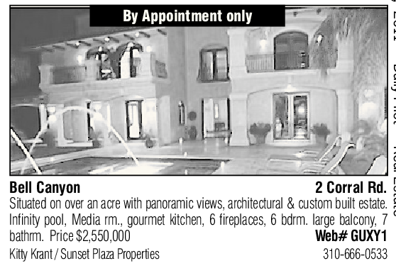 By Appointment only Bell Canyon 2 Corral Rd. Infinity pool, Media rm., gourmet kitchen, 6 fireplaces, 6 bdrm. large balcony, 7 Situated on over an acre with panoramic views, architectural & custom built estate. bathrm. Price $2,550,000 Web# GUXY1 Kitty Krant / Sunset Plaza Properties 310-666-0533
