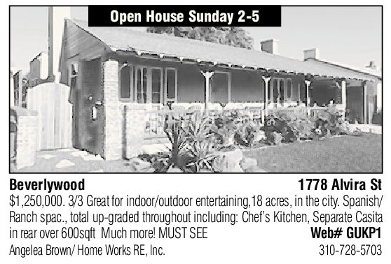 Beverlywood 1778 Alvira St $1,250,000. 3/3 Great for indoor/outdoor entertaining,18 acres, in the city. Spanish/ Ranch spac., total up-graded throughout including: Chef’s Kitchen, Separate Casita in rear over 600sqft Much more! MUST SEE Web# GUKP1 Angelea Brown/ Home Works RE, Inc. 310-728-5703