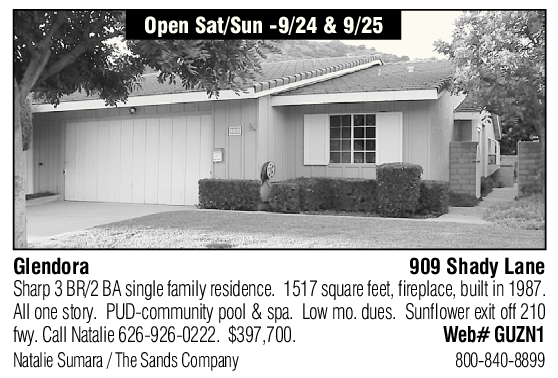 Open Sat/Sun -9/24 & 9/25 Glendora 909 Shady Lane Sharp 3 BR/2 BA single family residence. 1517 square feet, fireplace, built in 1987. All one story. PUD-community pool & spa. Low mo. dues. Sunflower exit off 210 fwy. Call Natalie 626-926-0222. $397,700. Web# GUZN1 Natalie Sumara / The Sands Company 800-840-8899