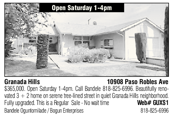 Granada Hills 10908 Paso Robles Ave $365,000. Open Saturday 1-4pm. Call Bandele 818-825-6996. Beautifully renovated3+2home on serene tree-lined street in quiet Granada Hills neighborhood.