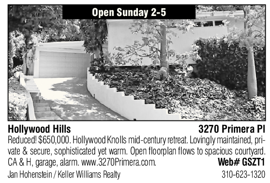 Reduced! $650,000. Hollywood Knolls mid-century retreat. Lovingly maintained, pri- CA & H, garage, alarm. www.3270Primera.com. Web# GSZT1 Jan Hohenstein / Keller Williams Realty 310-623-1320