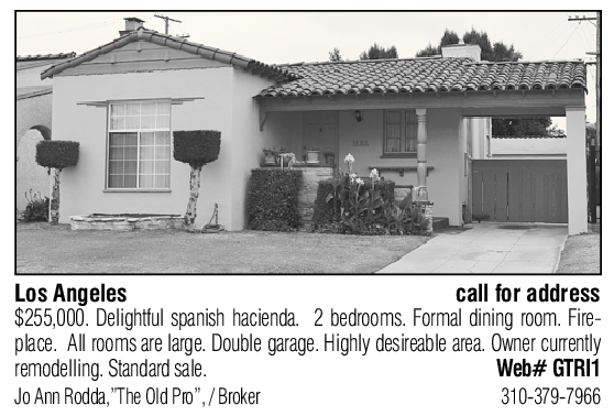 Los Angeles call for address $255,000. Delightful spanish hacienda. 2 bedrooms. Formal dining room. Fireplace. All rooms are large. Double garage. Highly desireable area. Owner currently remodelling. Standard sale. Web# GTRI1 Jo Ann Rodda,”The Old Pro”, / Broker 310-379-7966