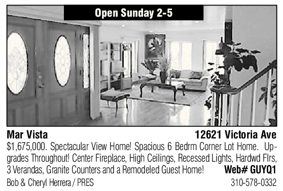 Mar Vista 12621 Victoria Ave $1,675,000. Spectacular View Home! Spacious 6 Bedrm Corner Lot Home. Upgrades Throughout! Center Fireplace, High Ceilings, Recessed Lights, Hardwd Flrs, 3 Verandas, Granite Counters and a Remodeled Guest Home! Web# GUYQ1 Bob & Cheryl Herrera / PRES 310-578-0332
