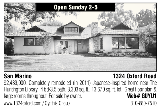 San Marino 1324 Oxford Road Huntington Library. 4 bd/3.5 bath, 3,303 sq. ft., 13,670 sq. ft. lot. Great floor plan & $2,489,000. Completely remodeled (in 2011) Japanese-inspired home near The large rooms throughout. For sale by owner. Web# GUYU1 www.1324oxford.com / Cynthia Chou / 310-880-7510