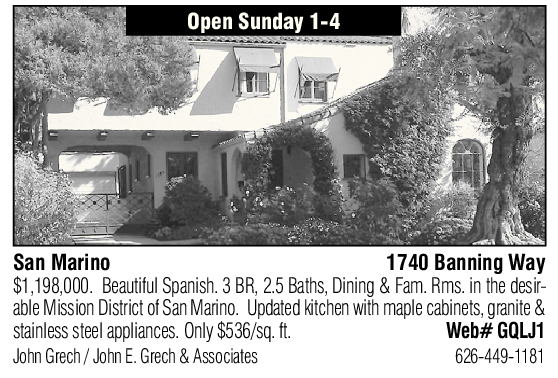 San Marino 1740 Banning Way $1,198,000. Beautiful Spanish. 3 BR, 2.5 Baths, Dining & Fam. Rms. in the desirable Mission District of San Marino. Updated kitchen with maple cabinets, granite &