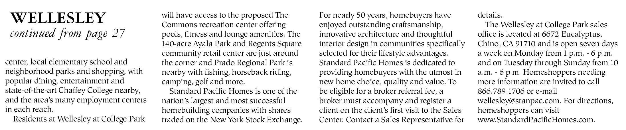 WELLESLEY continued from page 27 center, local elementary school and neighborhood parks and shopping, with popular dining, entertainment and state-of-the-art Chaffey College nearby, and the area’s many employment centers in each reach. Residents at Wellesley at College Park will have access to the proposed The Commons recreation center offering pools, fitness and lounge amenities. The 140-acre Ayala Park and Regents Square community retail center are just around the corner and Prado Regional Park is nearby with fishing, horseback riding, camping, golf and more. Standard Pacific Homes is one of the nation’s largest and most successful homebuilding companies with shares traded on the New York Stock Exchange. For nearly 50 years, homebuyers have enjoyed outstanding craftsmanship, innovative architecture and thoughtful interior design in communities specifically selected for their lifestyle advantages. Standard Pacific Homes is dedicated to providing homebuyers with the utmost in new home choice, quality and value. To be eligible for a broker referral fee, a broker must accompany and register a client on the client’s first visit to the Sales Center. Contact a Sales Representative for details. The Wellesley at College Park sales office is located at 6672 Eucalyptus, Chino, CA 91710 and is open seven days a week on Monday from 1 p.m. - 6 p.m. and on Tuesday through Sunday from 10 a.m. - 6 p.m. Homeshoppers needing more information are invited to call 866.789.1706 or e-mail wellesley@stanpac.com. For directions, homeshoppers can visit www.StandardPacificHomes.com.