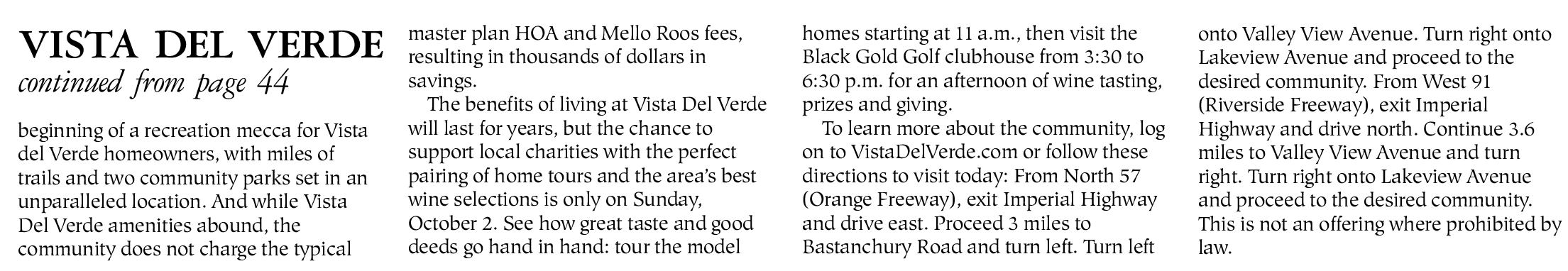 VISTA DEL VERDE continued from page 44 beginning of a recreation mecca for Vista del Verde homeowners, with miles of trails and two community parks set in an unparalleled location. And while Vista Del Verde amenities abound, the community does not charge the typical master plan HOA and Mello Roos fees, resulting in thousands of dollars in savings. The benefits of living at Vista Del Verde will last for years, but the chance to support local charities with the perfect pairing of home tours and the area’s best wine selections is only on Sunday, October 2. See how great taste and good deeds go hand in hand: tour the model homes starting at 11 a.m., then visit the Black Gold Golf clubhouse from 3:30 to 6:30 p.m. for an afternoon of wine tasting, prizes and giving. To learn more about the community, log on to VistaDelVerde.com or follow these directions to visit today: From North 57 (Orange Freeway), exit Imperial Highway and drive east. Proceed 3 miles to Bastanchury Road and turn left. Turn left onto Valley View Avenue. Turn right onto Lakeview Avenue and proceed to the desired community. From West 91 (Riverside Freeway), exit Imperial Highway and drive north. Continue 3.6 miles to Valley View Avenue and turn right. Turn right onto Lakeview Avenue and proceed to the desired community. This is not an offering where prohibited by law.