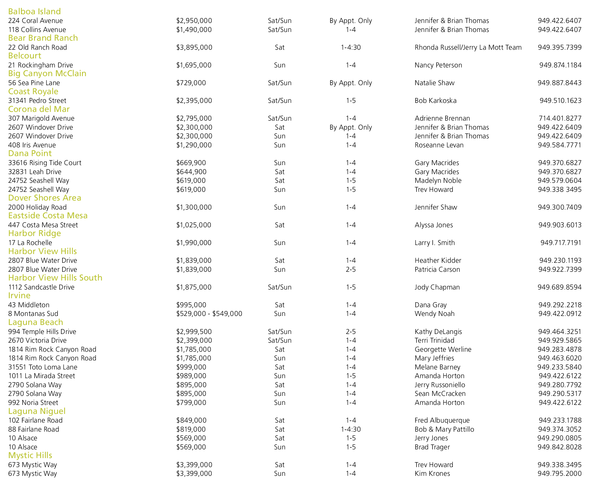 Balboa Island 224 Coral Avenue $2,950,000 Sat/Sun By Appt. Only Jennifer & Brian Thomas 949.422.6407 118 Collins Avenue $1,490,000 Sat/Sun 1-4 Jennifer & Brian Thomas 949.422.6407 Bear Brand Ranch 22 Old Ranch Road $3,895,000 Sat 1-4:30 Rhonda Russell/Jerry La Mott Team 949.395.7399 Belcourt 21 Rockingham Drive $1,695,000 Sun 1-4 Nancy Peterson 949.874.1184 Big Canyon McClain 56 Sea Pine Lane $729,000 Sat/Sun By Appt. Only Natalie Shaw 949.887.8443 Coast Royale 31341 Pedro Street $2,395,000 Sat/Sun 1-5 Bob Karkoska 949.510.1623 Corona del Mar 307 Marigold Avenue $2,795,000 Sat/Sun 1-4 Adrienne Brennan 714.401.8277 2607 Windover Drive $2,300,000 Sat By Appt. Only Jennifer & Brian Thomas 949.422.6409 2607 Windover Drive $2,300,000 Sun 1-4 Jennifer & Brian Thomas 949.422.6409 408 Iris Avenue $1,290,000 Sun 1-4 Roseanne Levan 949.584.7771 Dana Point 33616 Rising Tide Court $669,900 Sun 1-4 Gary Macrides 949.370.6827 32831 Leah Drive $644,900 Sat 1-4 Gary Macrides 949.370.6827 24752 Seashell Way $619,000 Sat 1-5 Madelyn Noble 949.579.0604 24752 Seashell Way $619,000 Sun 1-5 Trev Howard 949.338 3495 Dover Shores Area 2000 Holiday Road $1,300,000 Sun 1-4 Jennifer Shaw 949.300.7409 Eastside Costa Mesa 447 Costa Mesa Street $1,025,000 Sat 1-4 Alyssa Jones 949.903.6013 Harbor Ridge 17 La Rochelle $1,990,000 Sun 1-4 Larry I. Smith 949.717.7191 Harbor View Hills 2807 Blue Water Drive $1,839,000 Sat 1-4 Heather Kidder 949.230.1193 2807 Blue Water Drive $1,839,000 Sun 2-5 Patricia Carson 949.922.7399 Harbor View Hills South 1112 Sandcastle Drive $1,875,000 Sat/Sun 1-5 Jody Chapman 949.689.8594 Irvine 43 Middleton $995,000 Sat 1-4 Dana Gray 949.292.2218 8 Montanas Sud $529,000 - $549,000 Sun 1-4 Wendy Noah 949.422.0912 Laguna Beach 994 Temple Hills Drive $2,999,500 Sat/Sun 2-5 Kathy DeLangis 949.464.3251 2670 Victoria Drive $2,399,000 Sat/Sun 1-4 Terri Trinidad 949.929.5865 1814 Rim Rock Canyon Road $1,785,000 Sat 1-4 Georgette Werline 949.283.4878 1814 Rim Rock Canyon Road $1,785,000 Sun 1-4 Mary Jeffries 949.463.6020 31551 Toto Loma Lane $999,000 Sat 1-4 Melane Barney 949.233.5840 1011 La Mirada Street $989,000 Sun 1-5 Amanda Horton 949.422.6122 2790 Solana Way $895,000 Sat 1-4 Jerry Russoniello 949.280.7792 2790 Solana Way $895,000 Sun 1-4 Sean McCracken 949.290.5317 992 Noria Street $799,000 Sun 1-4 Amanda Horton 949.422.6122 Laguna Niguel 102 Fairlane Road $849,000 Sat 1-4 Fred Albuquerque 949.233.1788 88 Fairlane Road $819,000 Sat 1-4:30 Bob & Mary Pattillo 949.374.3052 10 Alsace $569,000 Sat 1-5 Jerry Jones 949.290.0805 10 Alsace $569,000 Sun 1-5 Brad Trager 949.842.8028 Mystic Hills 673 Mystic Way $3,399,000 Sat 1-4 Trev Howard 949.338.3495 673 Mystic Way $3,399,000 Sun 1-4 Kim Krones 949.795.2000