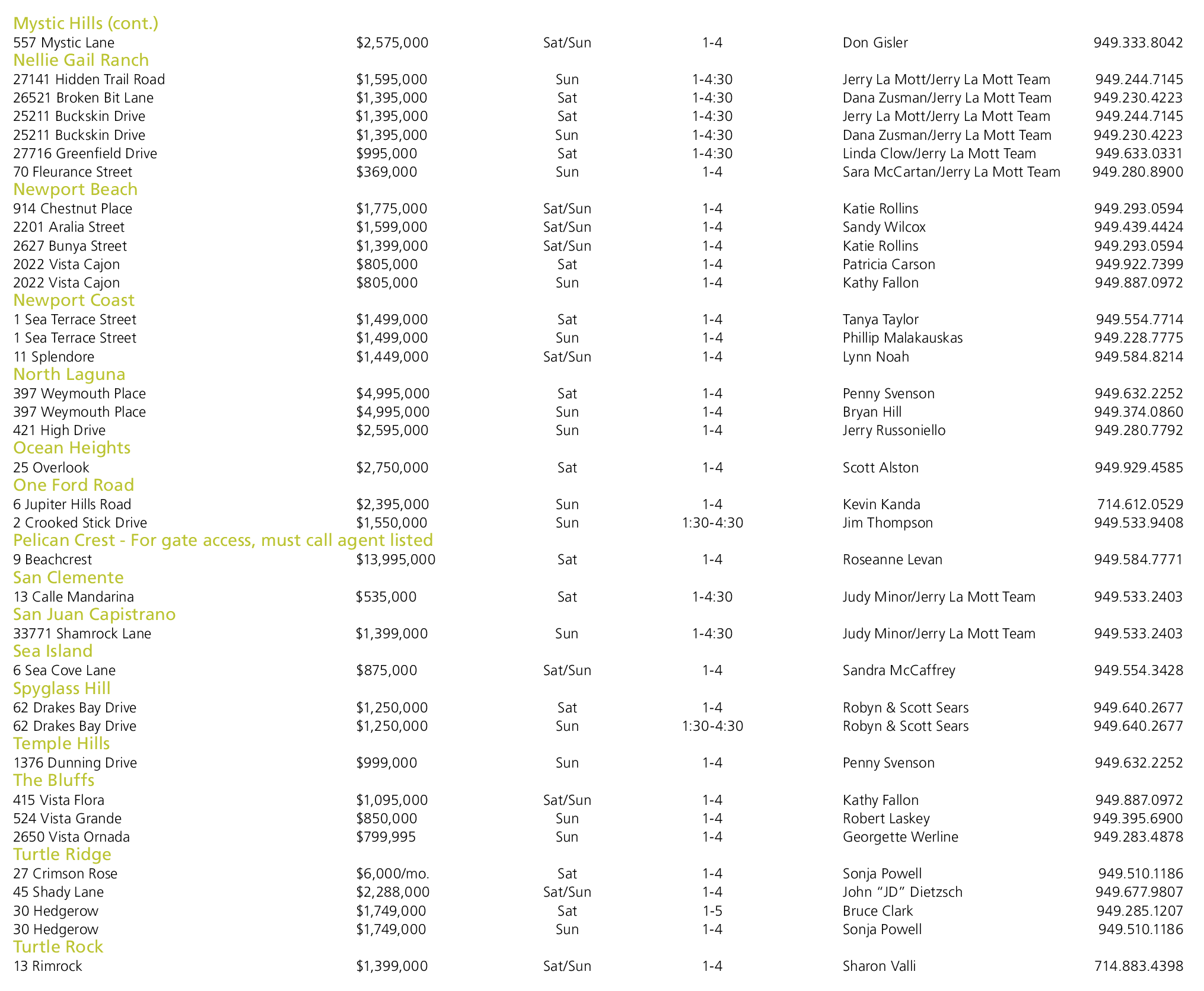 Mystic Hills (cont.) 557 Mystic Lane $2,575,000 Sat/Sun 1-4 Don Gisler 949.333.8042 Nellie Gail Ranch 27141 Hidden Trail Road $1,595,000 Sun 1-4:30 Jerry La Mott/Jerry La Mott Team 949.244.7145 26521 Broken Bit Lane $1,395,000 Sat 1-4:30 Dana Zusman/Jerry La Mott Team 949.230.4223 25211 Buckskin Drive $1,395,000 Sat 1-4:30 Jerry La Mott/Jerry La Mott Team 949.244.7145 25211 Buckskin Drive $1,395,000 Sun 1-4:30 Dana Zusman/Jerry La Mott Team 949.230.4223 27716 Greenfield Drive $995,000 Sat 1-4:30 Linda Clow/Jerry La Mott Team 949.633.0331 70 Fleurance Street $369,000 Sun 1-4 Sara McCartan/Jerry La Mott Team 949.280.8900 Newport Beach 914 Chestnut Place $1,775,000 Sat/Sun 1-4 Katie Rollins 949.293.0594 2201 Aralia Street $1,599,000 Sat/Sun 1-4 Sandy Wilcox 949.439.4424 2627 Bunya Street $1,399,000 Sat/Sun 1-4 Katie Rollins 949.293.0594 2022 Vista Cajon $805,000 Sat 1-4 Patricia Carson 949.922.7399 2022 Vista Cajon $805,000 Sun 1-4 Kathy Fallon 949.887.0972 Newport Coast 1 Sea Terrace Street $1,499,000 Sat 1-4 Tanya Taylor 949.554.7714 1 Sea Terrace Street $1,499,000 Sun 1-4 Phillip Malakauskas 949.228.7775 11 Splendore $1,449,000 Sat/Sun 1-4 Lynn Noah 949.584.8214 North Laguna 397 Weymouth Place $4,995,000 Sat 1-4 Penny Svenson 949.632.2252 397 Weymouth Place $4,995,000 Sun 1-4 Bryan Hill 949.374.0860 421 High Drive $2,595,000 Sun 1-4 Jerry Russoniello 949.280.7792 Ocean Heights 25 Overlook $2,750,000 Sat 1-4 Scott Alston 949.929.4585 One Ford Road 6 Jupiter Hills Road $2,395,000 Sun 1-4 Kevin Kanda 714.612.0529 2 Crooked Stick Drive $1,550,000 Sun 1:30-4:30 Jim Thompson 949.533.9408 Pelican Crest - For gate access, must call agent listed 9 Beachcrest $13,995,000 Sat 1-4 Roseanne Levan 949.584.7771 San Clemente 13 Calle Mandarina $535,000 Sat 1-4:30 Judy Minor/Jerry La Mott Team 949.533.2403 San Juan Capistrano 33771 Shamrock Lane $1,399,000 Sun 1-4:30 Judy Minor/Jerry La Mott Team 949.533.2403 Sea Island 6 Sea Cove Lane $875,000 Sat/Sun 1-4 Sandra McCaffrey 949.554.3428 Spyglass Hill 62 Drakes Bay Drive $1,250,000 Sat 1-4 Robyn & Scott Sears 949.640.2677 62 Drakes Bay Drive $1,250,000 Sun 1:30-4:30 Robyn & Scott Sears 949.640.2677 Temple Hills 1376 Dunning Drive $999,000 Sun 1-4 Penny Svenson 949.632.2252 The Bluffs 415 Vista Flora $1,095,000 Sat/Sun 1-4 Kathy Fallon 949.887.0972 524 Vista Grande $850,000 Sun 1-4 Robert Laskey 949.395.6900 2650 Vista Ornada $799,995 Sun 1-4 Georgette Werline 949.283.4878 Turtle Ridge 27 Crimson Rose $6,000/mo. Sat 1-4 Sonja Powell 949.510.1186 45 Shady Lane $2,288,000 Sat/Sun 1-4 John “JD” Dietzsch 949.677.9807 30 Hedgerow $1,749,000 Sat 1-5 Bruce Clark 949.285.1207 30 Hedgerow $1,749,000 Sun 1-4 Sonja Powell 949.510.1186 Turtle Rock 13 Rimrock $1,399,000 Sat/Sun 1-4 Sharon Valli 714.883.4398
