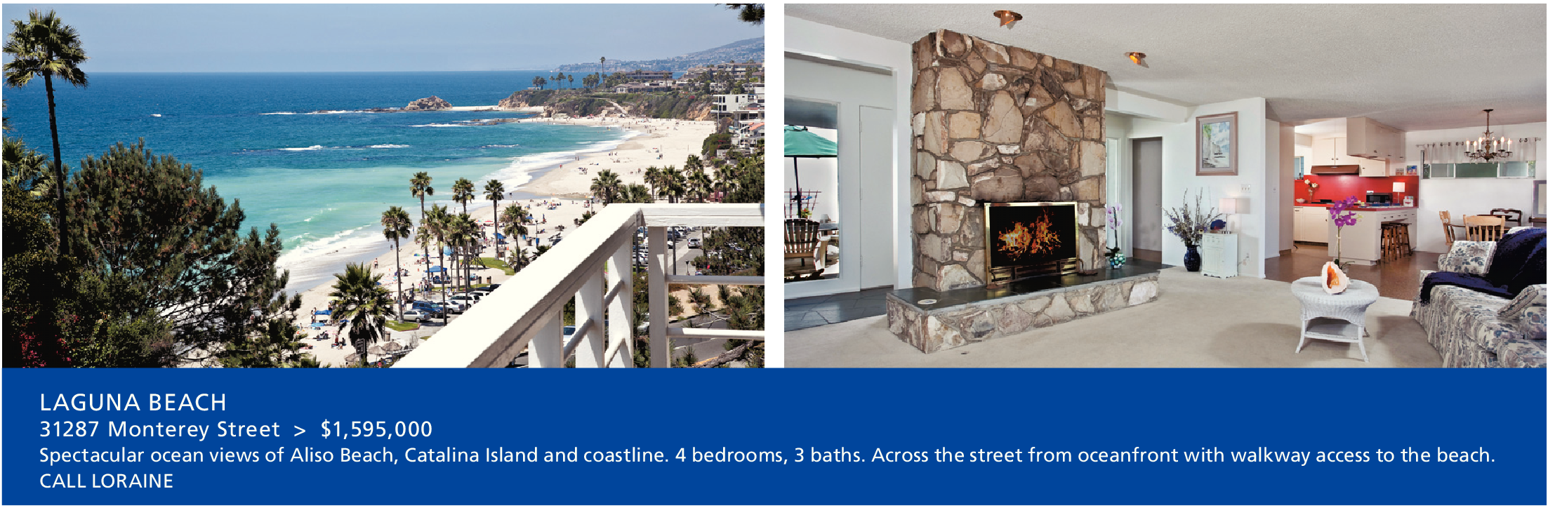 LAGUNA BEACH 31287 Monterey Street > $1,595,000 Spectacular ocean views of Aliso Beach, Catalina Island and coastline. 4 bedrooms, 3 baths. Across the street from oceanfront with walkway access to the beach. CALL LORAINE