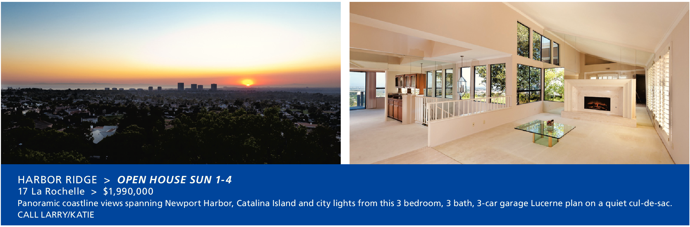 HARBOR RIDGE > OPEN HOUSE SUN 1-4 17 La Rochelle > $1,990,000 Panoramic coastline views spanning Newport Harbor, Catalina Island and city lights from this 3 bedroom, 3 bath, 3-car garage Lucerne plan on a quiet cul-de-sac. CALL LARRY/KATIE