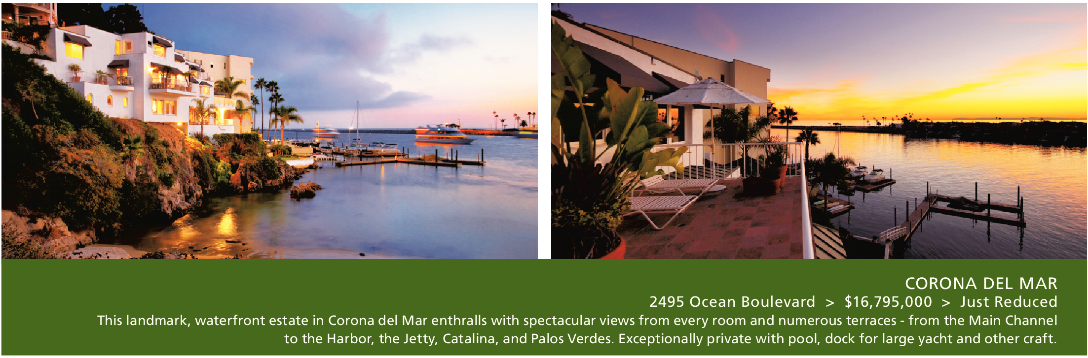 CORONA DEL MAR 2495 Ocean Boulevard > $16,795,000 > Just Reduced This landmark, waterfront estate in Corona del Mar enthralls with spectacular views from every room and numerous terraces - from the Main Channel to the Harbor, the Jetty, Catalina, and Palos Verdes. Exceptionally private with pool, dock for large yacht and other craft.