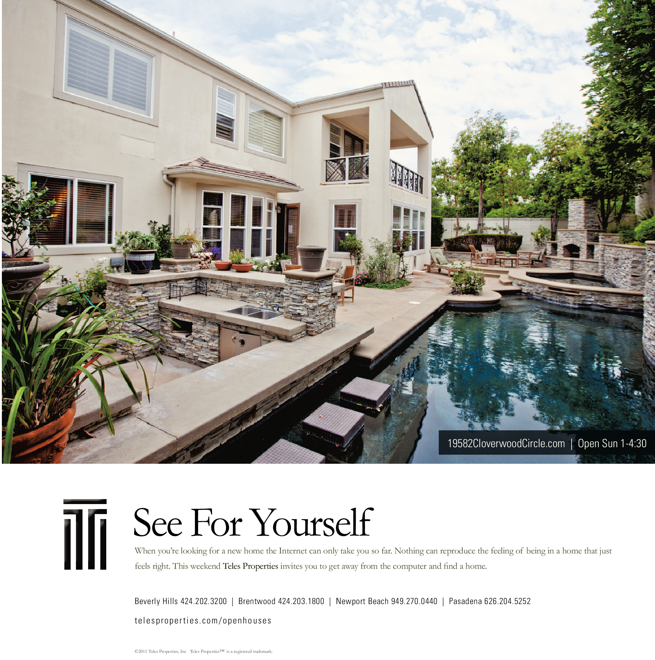 See For Yourself When you’re looking for a new home the Internet can only take you so far. Nothing can reproduce the feeling of being in a home that just feels right. This weekend Teles Properties invites you to get away from the computer and find a home. Beverly Hills 424.202.3200 | Brentwood 424.203.1800 | Newport Beach 949.270.0440 | Pasadena 626.204.5252 telesproperties.com/openhouses ©2011 Teles Properties, Inc Teles Properties™ is a registered trademark. 19582CloverwoodCircle.com | Open Sun 1-4:30
