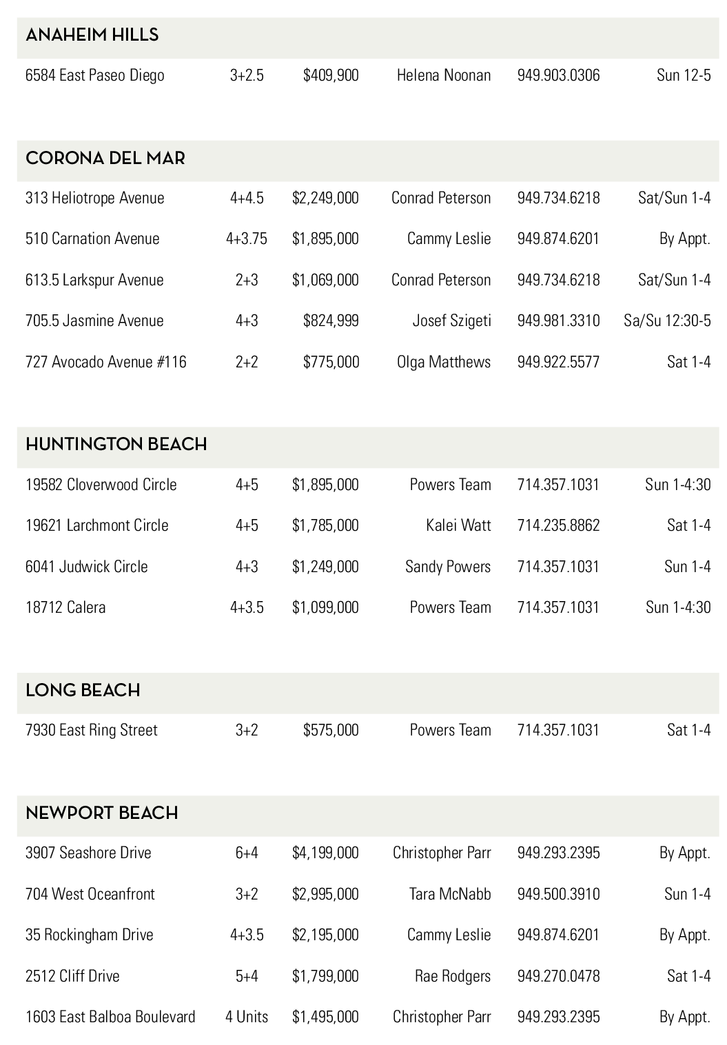 510 Carnation Avenue 4+3.75 $1,895,000 Cammy Leslie 949.874.6201 By Appt.