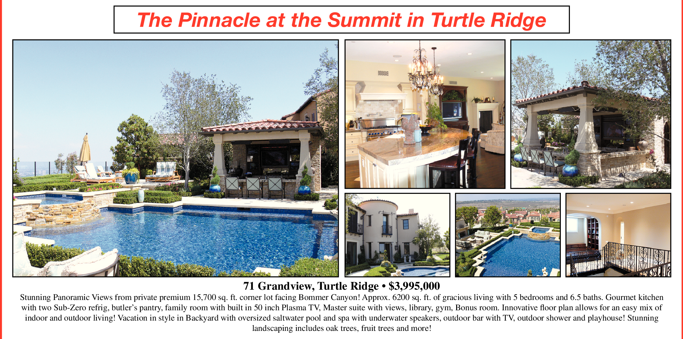 The Pinnacle at the Summit in Turtle Ridge 71 Grandview, Turtle Ridge • $3,995,000 Stunning Panoramic Views from private premium 15,700 sq. ft. corner lot facing Bommer Canyon! Approx. 6200 sq. ft. of gracious living with 5 bedrooms and 6.5 baths. Gourmet kitchen with two Sub-Zero refrig, butler’s pantry, family room with built in 50 inch Plasma TV, Master suite with views, library, gym, Bonus room. Innovative floor plan allows for an easy mix of indoor and outdoor living! Vacation in style in Backyard with oversized saltwater pool and spa with underwater speakers, outdoor bar with TV, outdoor shower and playhouse! Stunning landscaping includes oak trees, fruit trees and more!