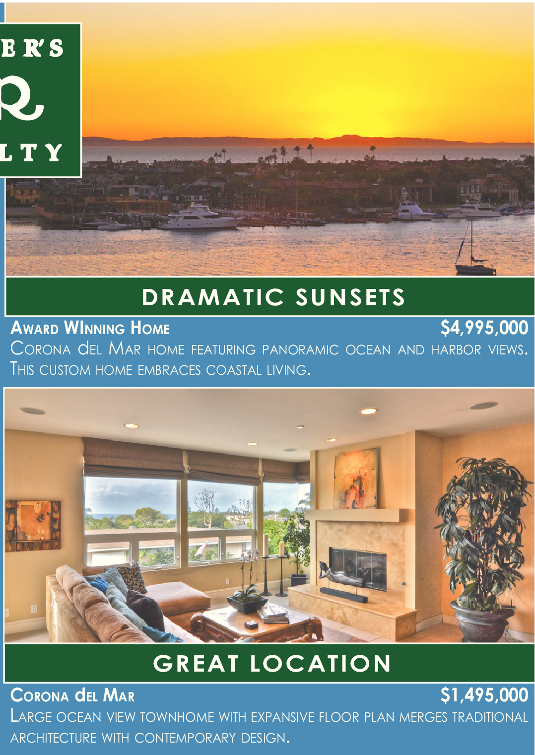 DRAMATIC SUNSETS AWARD WINNING HOME $4,995,000 CORONA dEL MAR HOME FEATURING PANORAMIC OCEAN AND HARBOR VIEWS. THIS CUSTOM HOME EMBRACES COASTAL LIVING. GREAT LOCATION CORONA dEL MAR $1,495,000 LARGE OCEAN VIEW TOWNHOME WITH EXPANSIVE FLOOR PLAN MERGES TRADITIONAL ARCHITECTURE WITH CONTEMPORARY DESIGN.