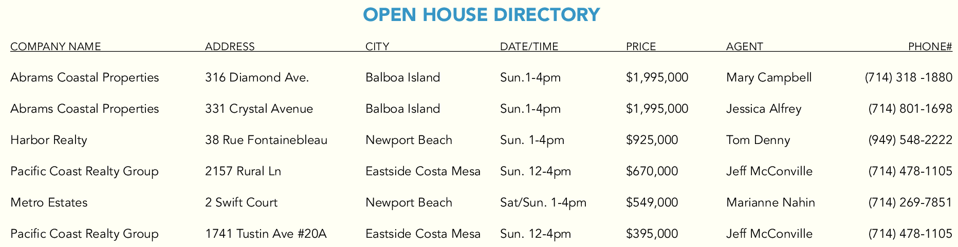 OPEN HOUSE DIRECTORY COMPANY NAME ADDRESS CITY DATE/TIME PRICE AGENT PHONE# Abrams Coastal Properties 316 Diamond Ave. Balboa Island Sun.1-4pm $1,995,000 Mary Campbell (714) 318 -1880 Abrams Coastal Properties 331 Crystal Avenue Balboa Island Sun.1-4pm $1,995,000 Jessica Alfrey (714) 801-1698 Harbor Realty 38 Rue Fontainebleau Newport Beach Sun. 1-4pm $925,000 Tom Denny (949) 548-2222 Pacific Coast Realty Group 2157 Rural Ln Eastside Costa Mesa Sun. 12-4pm $670,000 Jeff McConville (714) 478-1105 Metro Estates 2 Swift Court Newport Beach Sat/Sun. 1-4pm $549,000 Marianne Nahin (714) 269-7851 Pacific Coast Realty Group 1741 Tustin Ave #20A Eastside Costa Mesa Sun. 12-4pm $395,000 Jeff McConville (714) 478-1105