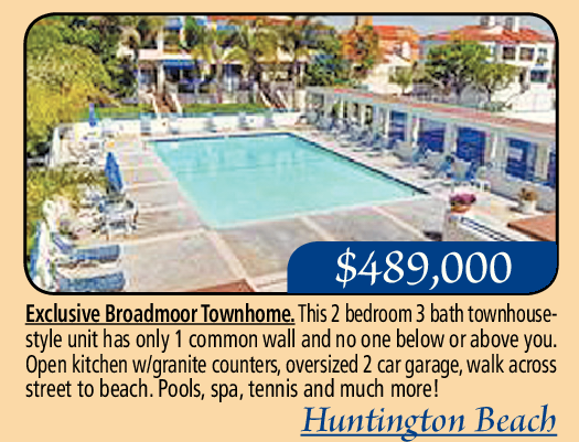 $489,000 Exclusive Broadmoor Townhome. This 2 bedroom 3 bath townhousestyle unit has only 1 common wall and no one below or above you. Open kitchen w/granite counters, oversized 2 car garage, walk across street to beach. Pools, spa, tennis and much more! Huntington Beach See also