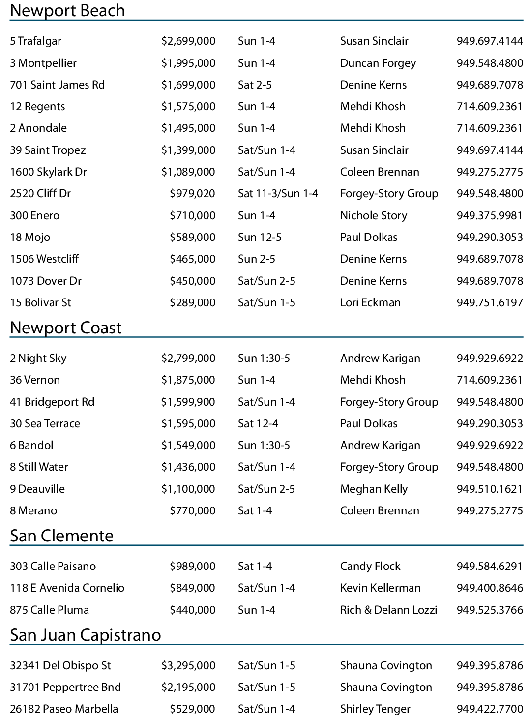 5 Trafalgar $2,699,000 Sun 1-4 Susan Sinclair 949.697.4144 3 Montpellier $1,995,000 Sun 1-4 Duncan Forgey 949.548.4800 701 Saint James Rd $1,699,000 Sat 2-5 Denine Kerns 949.689.7078 12 Regents $1,575,000 Sun 1-4 Mehdi Khosh 714.609.2361 2 Anondale $1,495,000 Sun 1-4 Mehdi Khosh 714.609.2361 39 Saint Tropez $1,399,000 Sat/Sun 1-4 Susan Sinclair 949.697.4144 1600 Skylark Dr $1,089,000 Sat/Sun 1-4 Coleen Brennan 949.275.2775 2520 Cliff Dr $979,020 Sat 11-3/Sun 1-4 Forgey-Story Group 949.548.4800 300 Enero $710,000 Sun 1-4 Nichole Story 949.375.9981 18 Mojo $589,000 Sun 12-5 Paul Dolkas 949.290.3053 1506 Westcliff $465,000 Sun 2-5 Denine Kerns 949.689.7078 1073 Dover Dr $450,000 Sat/Sun 2-5 Denine Kerns 949.689.7078 15 Bolivar St $289,000 Sat/Sun 1-5 Lori Eckman 949.751.6197