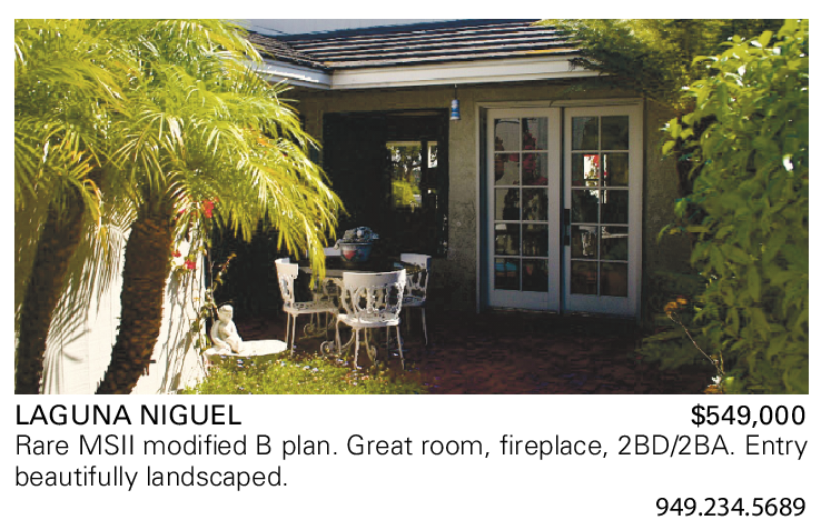 LAGUNA NIGUEL $549,000 Rare MSII modified B plan. Great room, fireplace, 2BD/2BA. Entry beautifully landscaped.