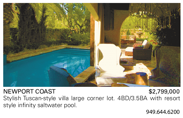 NEWPORT COAST $2,799,000 Stylish Tuscan-style villa large corner lot. 4BD/3.5BA with resort style infinity saltwater pool.