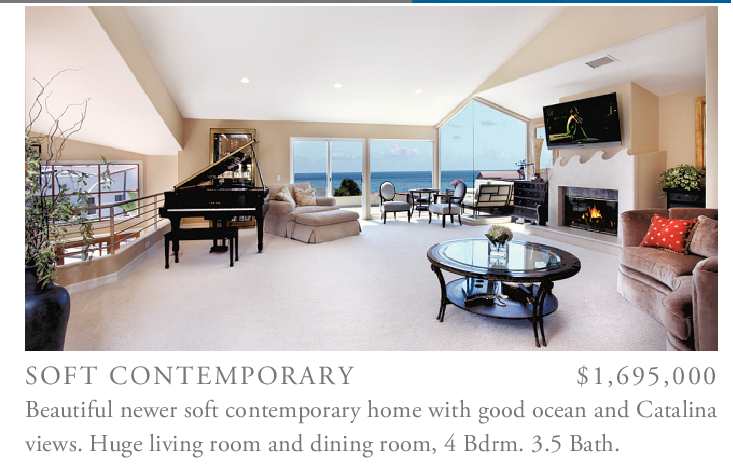 SOFT CONTEMPORARY $1,695,000 Beautiful newer soft contemporary home with good ocean and Catalina views. Huge living room and dining room, 4 Bdrm. 3.5 Bath.