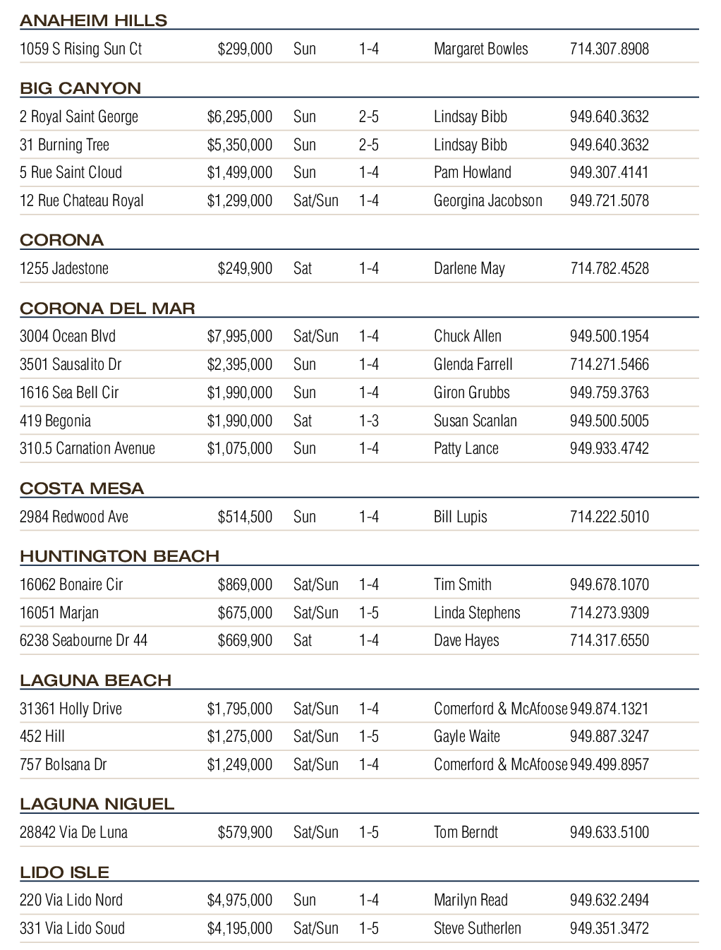 LAGUNA BEACH 31361 Holly Drive $1,795,000 Sat/Sun 1-4 Comerford & McAfoose 949.874.1321 452 Hill $1,275,000 Sat/Sun 1-5 Gayle Waite 949.887.3247 757 Bolsana Dr $1,249,000 Sat/Sun 1-4 Comerford & McAfoose 949.499.8957