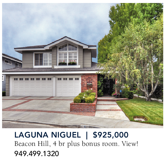 LAGUNA NIGUEL | $925,000 Beacon Hill, 4 br plus bonus room. View! 949.499.1320