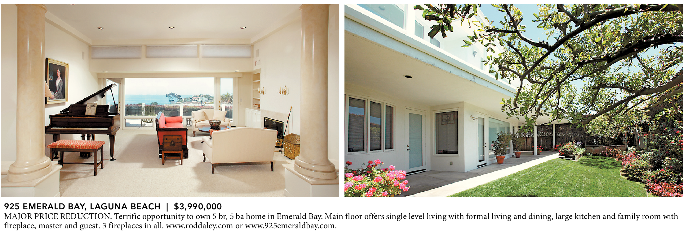 925 EMERALD BAY, LAGUNA BEACH | $3,990,000 MAJOR PRICE REDUCTION. Terrific opportunity to own 5 br, 5 ba home in Emerald Bay. Main floor offers single level living with formal living and dining, large kitchen and family room with fireplace, master and guest. 3 fireplaces in all. www.roddaley.com or www.925emeraldbay.com.