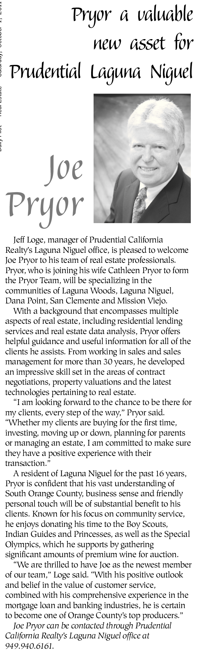 Jeff Loge, manager of Prudential California Realty’s Laguna Niguel office, is pleased to welcome Joe Pryor to his team of real estate professionals. Pryor, who is joining his wife Cathleen Pryor to form the Pryor Team, will be specializing in the communities of Laguna Woods, Laguna Niguel, Dana Point, San Clemente and Mission Viejo.