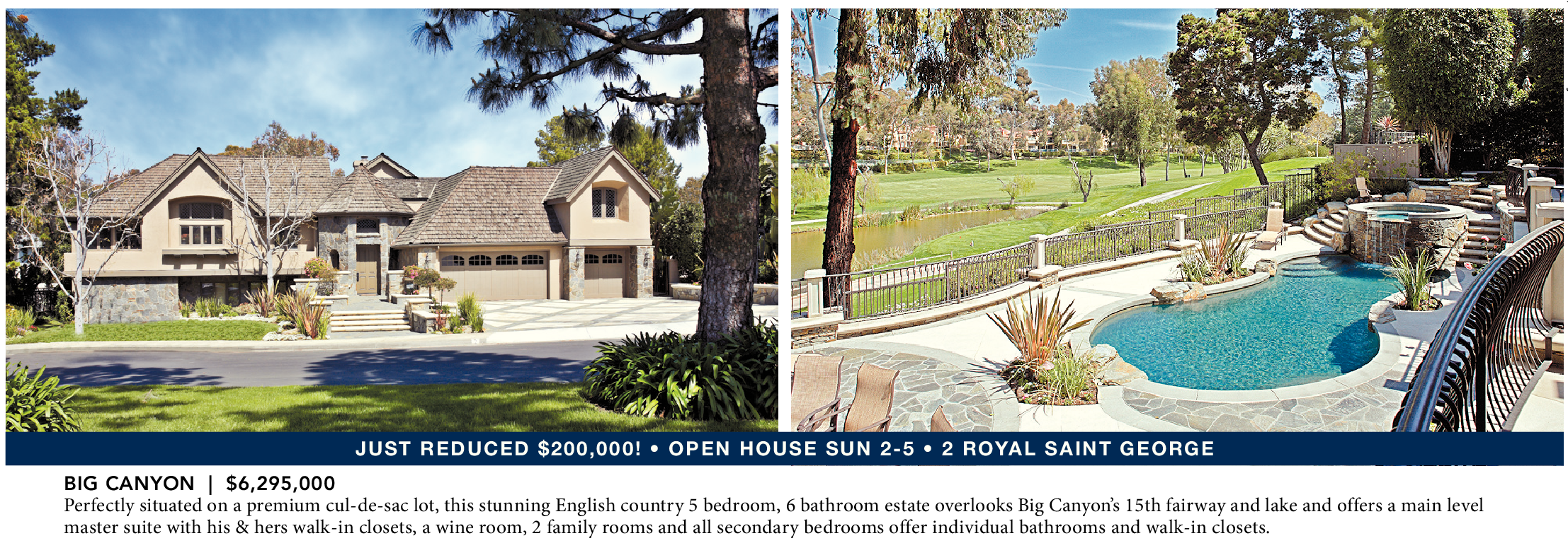 BIG CANYON | $6,295,000 Perfectly situated on a premium cul-de-sac lot, this stunning English country 5 bedroom, 6 bathroom estate overlooks Big Canyon’s 15th fairway and lake and offers a main level master suite with his & hers walk-in closets, a wine room, 2 family rooms and all secondary bedrooms offer individual bathrooms and walk-in closets.