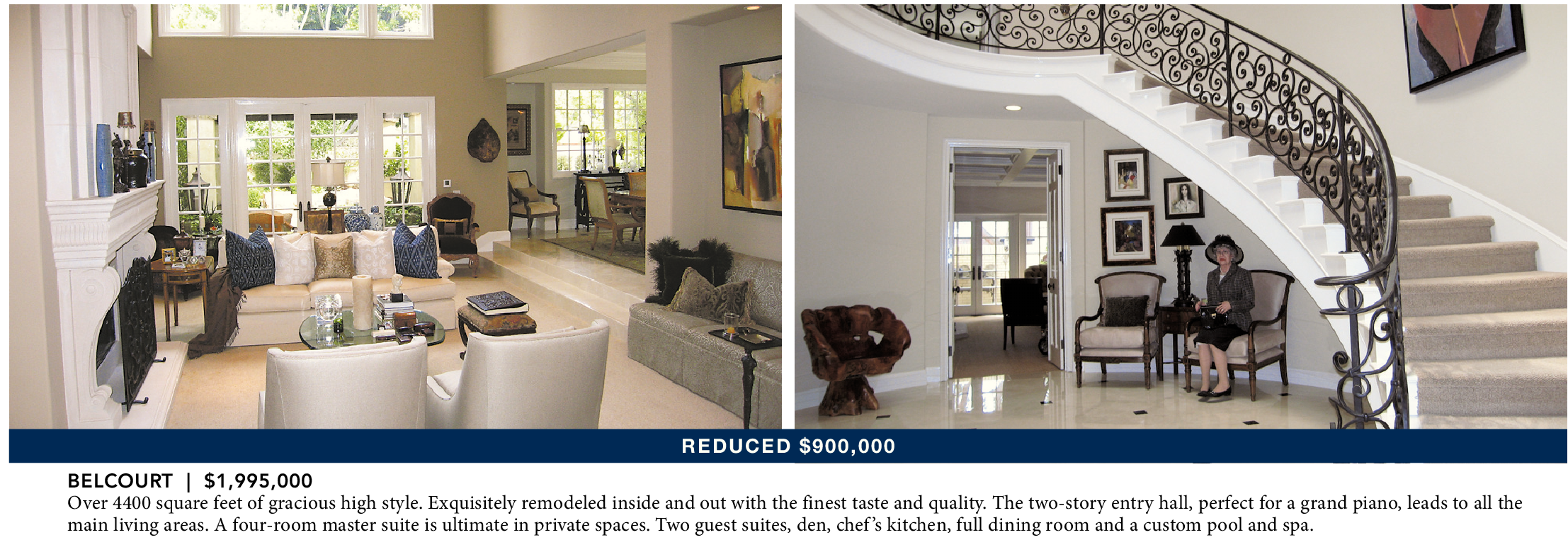 BELCOURT | $1,995,000 Over 4400 square feet of gracious high style. Exquisitely remodeled inside and out with the finest taste and quality. The two-story entry hall, perfect for a grand piano, leads to all the main living areas. A four-room master suite is ultimate in private spaces. Two guest suites, den, chef ’s kitchen, full dining room and a custom pool and spa.