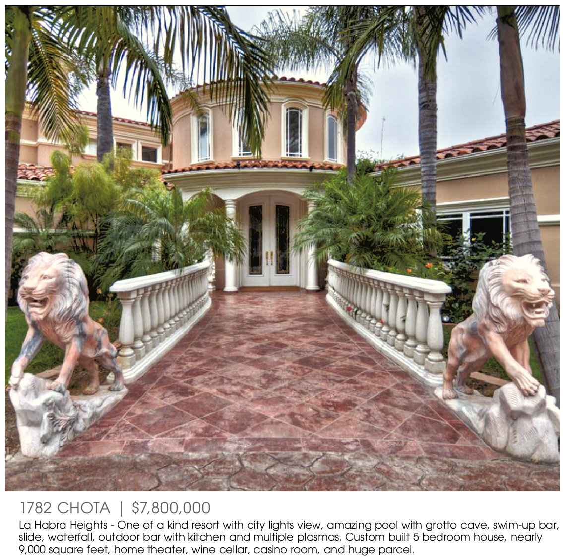 1782 CHOTA | $7,800,000 La Habra Heights - One of a kind resort with city lights view, amazing pool with grotto cave, swim-up bar, slide, waterfall, outdoor bar with kitchen and multiple plasmas. Custom built 5 bedroom house, nearly 9,000 square feet, home theater, wine cellar, casino room, and huge parcel.