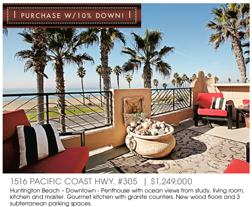 | PURCHASE W/10% DOWN! | 1516 PACIFIC COAST HWY. #305 | $1,249,000 Huntington Beach – Downtown - Penthouse with ocean views from study, living room, kitchen and master. Gourmet kitchen with granite counters. New wood floors and 3 subterranean parking spaces.