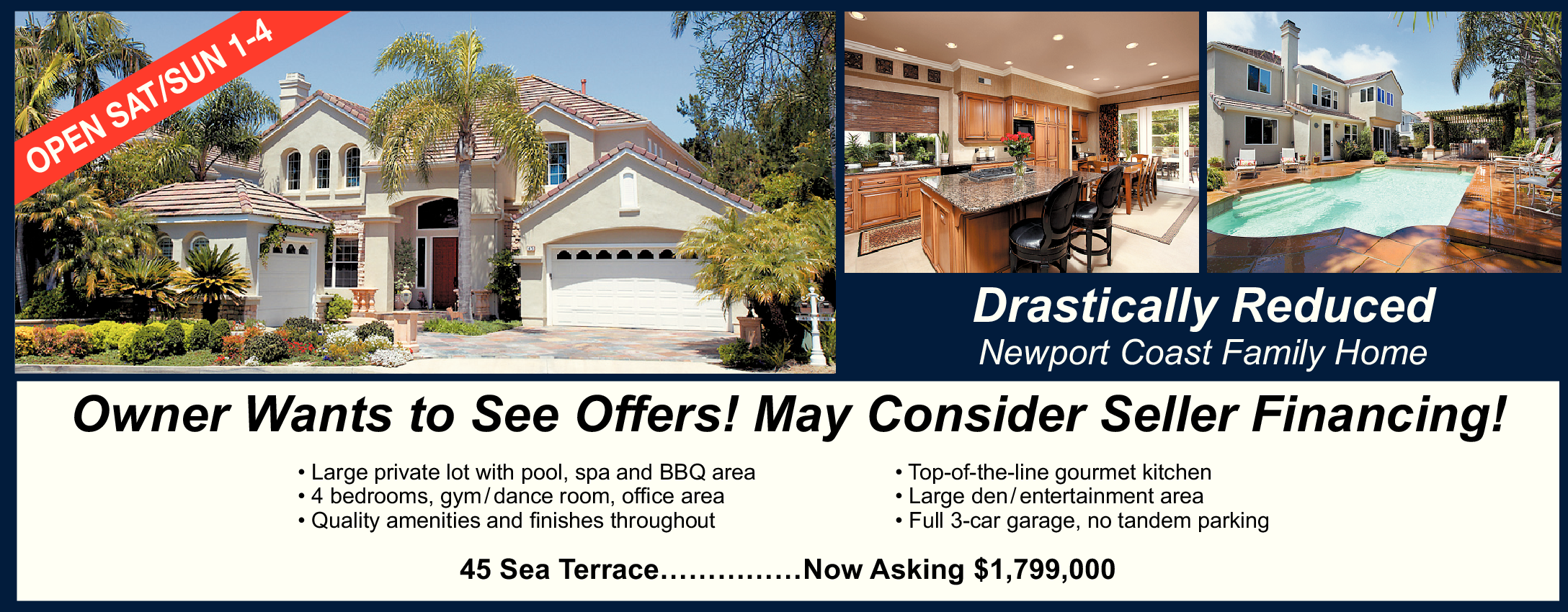 Drastically Reduced Newport Coast Family Home Owner Wants to See Offers! May Consider Seller Financing! • Large private lot with pool, spa and BBQ area • 4 bedrooms, gym / dance room, offi ce area • Quality amenities and fi nishes throughout • Top-of-the-line gourmet kitchen • Large den / entertainment area • Full 3-car garage, no tandem parking 45 Sea Terrace……………Now Asking $1,799,000